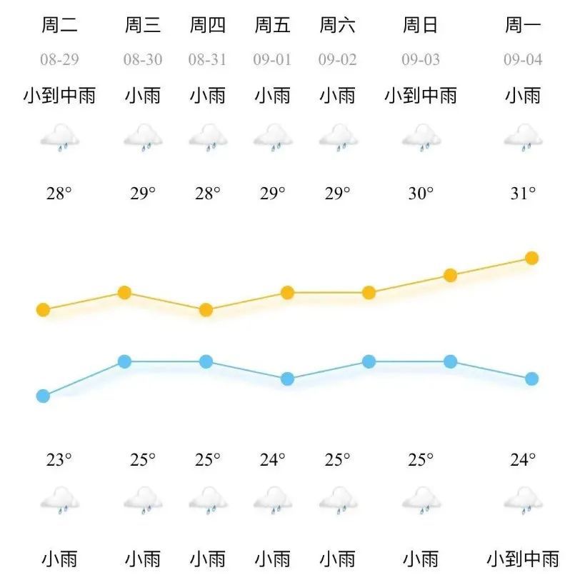 据宁波市气象台消息,今天雨水继续,并且雨水将一直延续到下月初。冷空气也如约而至,今天气温下降明显,白天最高气温仅28℃左右,体感上凉爽了许多。接下来几天气温也都差不多,最低气温23℃-25℃,最高气温28℃-31℃。