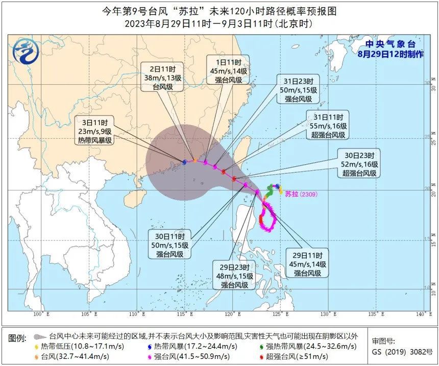 预计,“苏拉”将以每小时10-15公里的速度向北偏西方向移动,于31日早晨移入南海东北部海面,强度将再次增强,并逐渐向福建南部到广东东部一带沿海靠近,有可能于9月1日夜间到2日上午在广东东部一带沿海登陆(台风级或强台风级,35-42米/秒,12-14级),也有可能在广东东部近岸海面向西偏南方向移动。