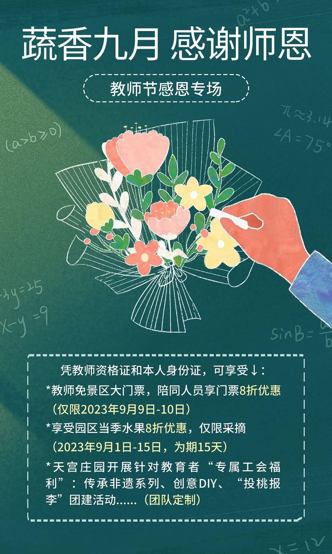 9月9日-28日,持本人身份证和教师证,享受景区免票优惠,所有游乐项目畅玩,随行教师家属持户口本及本人身份证可享受基础门票5折优惠(联票除外),1.2-1.5米儿童30元/人,不同时享受优惠。