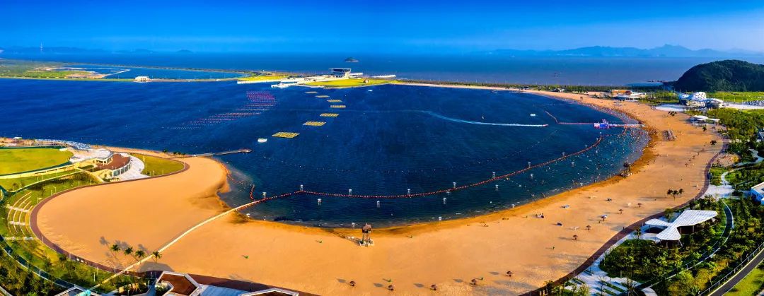 梅山湾沙滩公园有长达1.88公里的巨型沙滩。凭高远眺,可以看到一大片深蓝色海面,弧形的万人沙滩好像一条金色项链。