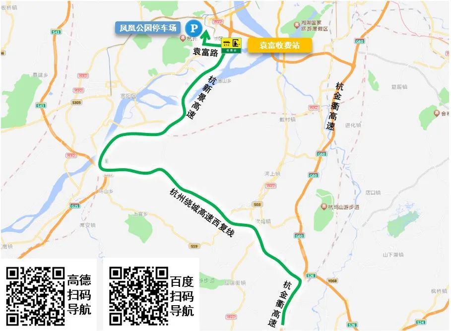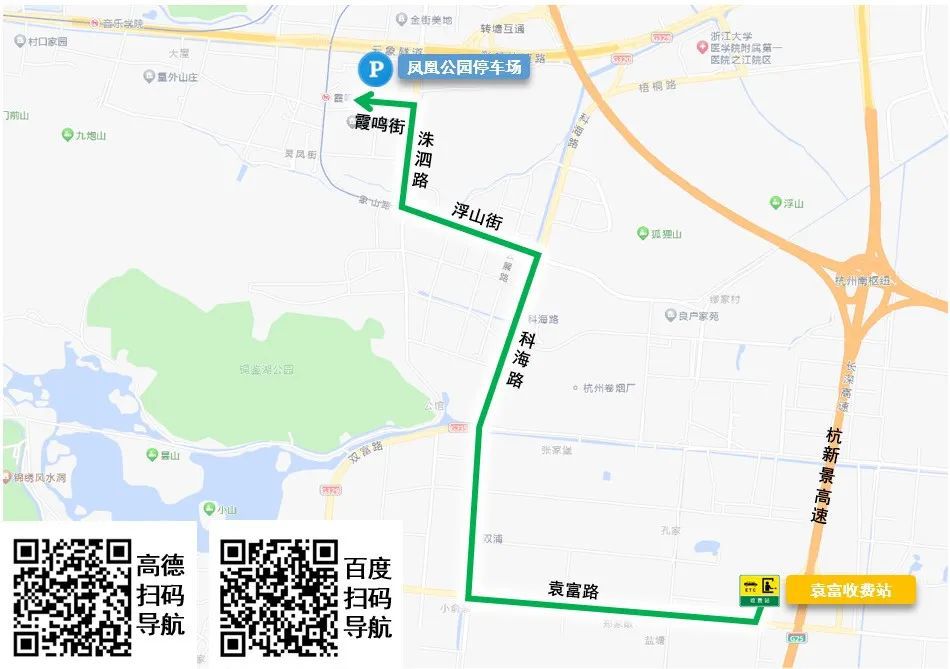 杭新景高速方向小客车建议可从袁富收费站驶出,途经袁富路-科海路-浮山街-洙泗路-霞鸣街至凤凰公园停车场。