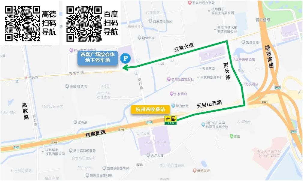 杭徽高速方向小客车建议可从杭州西收费站驶出,途经天目山西路-荆长路-五常大道至西嘉广场综合体地下停车场,该停车场附近可由地铁联胜路站换乘地铁3号线。