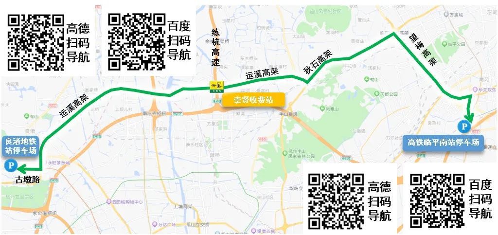 练杭高速方向小客车建议可从崇贤收费站驶出,可途经运溪高架-疏港公路-古墩路至良渚地铁站停车场,该停车场附近可由地铁良渚站换乘地铁2号线;或者途经运溪高架-秋石高架-望梅高架-新丰路-良熟路至高铁临平南站停车场,该停车场附近可由地铁临平南高铁站换乘地铁9号线。
