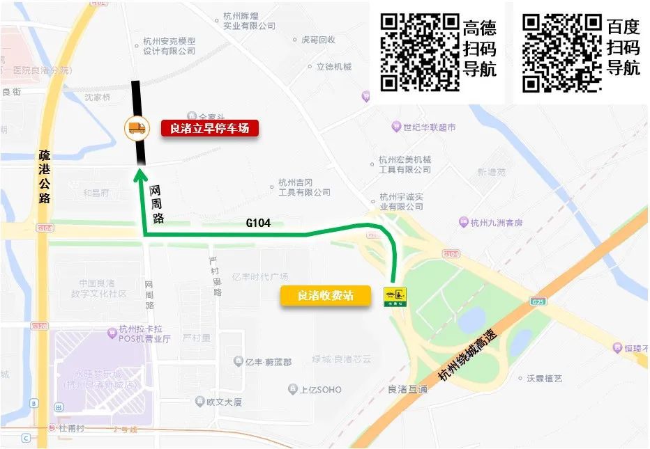 去往杭州西北方向货车建议可从绕城高速良渚收费站驶出,途经G104-网周路至良渚立早停车场。