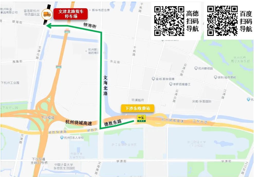 去往杭州城东方向货车建议可从绕城高速下沙东收费站驶出,途经德胜东路-文海北路-银海街至文津北路货车停车场。