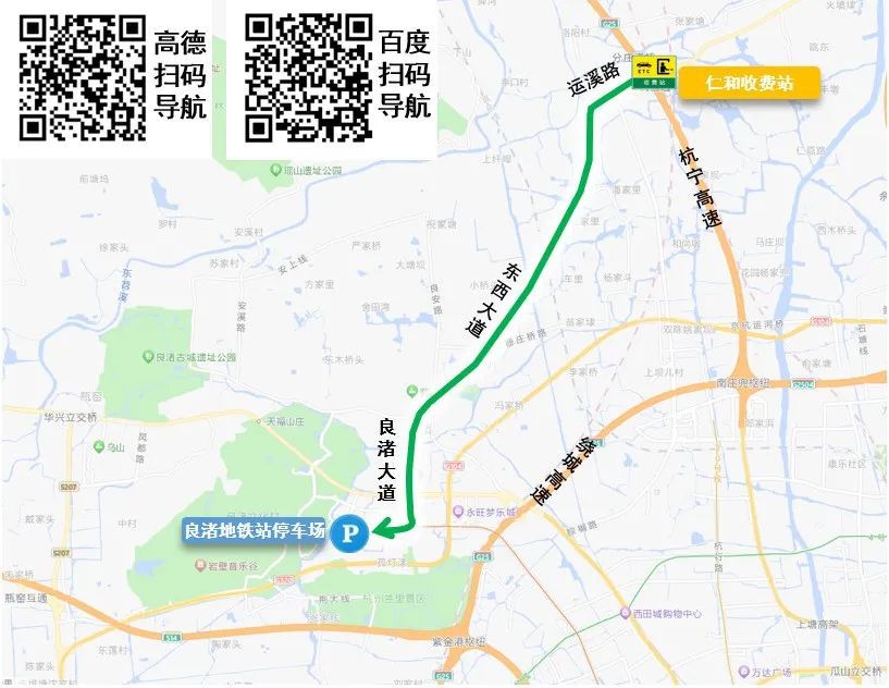 杭宁高速方向小客车建议可从仁和收费站驶出,途经运溪路-东西大道-良渚大道-古墩路至良渚地铁站停车场,该停车场附近可由地铁良渚站换乘地铁2号线。