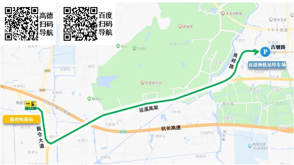杭长高速方向小客车建议可从瓶窑收费站驶出,途经瓶仓大道-运溪高架-良祥路-古墩路至良渚地铁站停车场,该停车场附近可由地铁良渚站换乘地铁2号线。