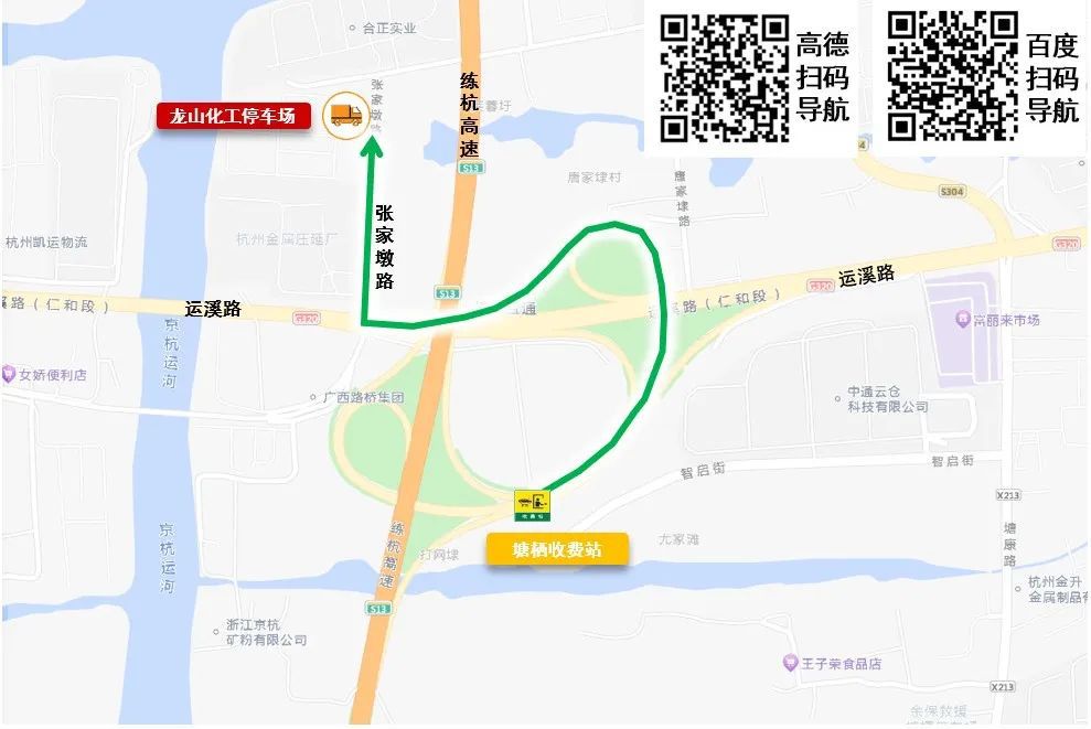 去往杭州城北方向货车建议可从练杭高速塘栖收费站驶出,途经运溪路-张家墩路至龙山化工停车场。