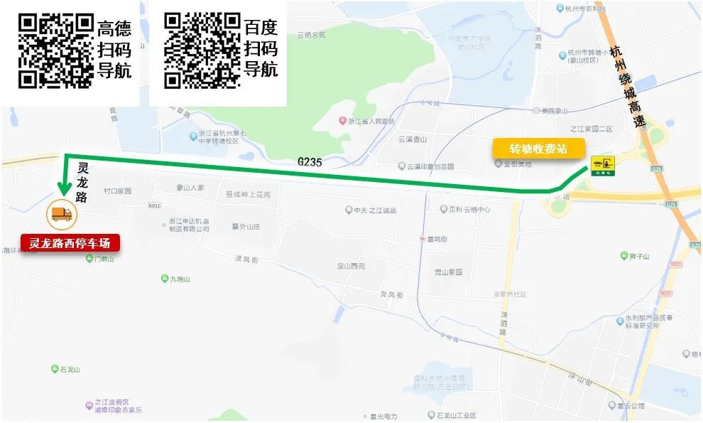 去往杭州西南方向货车建议可从绕城高速转塘收费站驶出,途经G235-灵龙路至灵龙路西停车场。