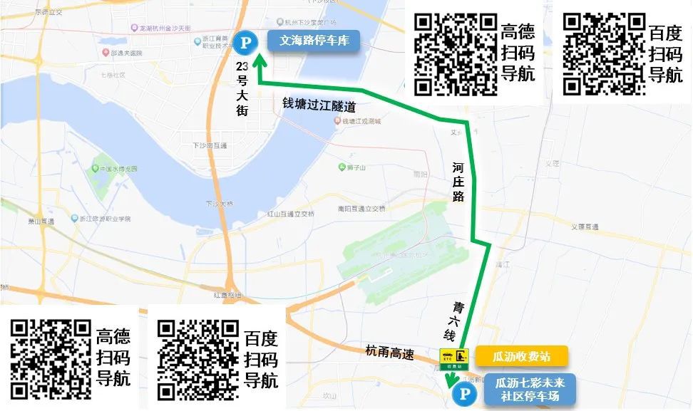 杭甬高速方向小客车建议可从瓜沥收费站驶出,途经青六线-建设四路至瓜沥七彩未来社区停车场,该停车场处可乘坐公交至地铁7号线坎山站、永盛路站;或者途经青六线-永盛路-河庄路-钱塘过江隧道-23号大街至文海路停车库,该停车场附近可由地铁文海南路站换乘地铁1、8号线。