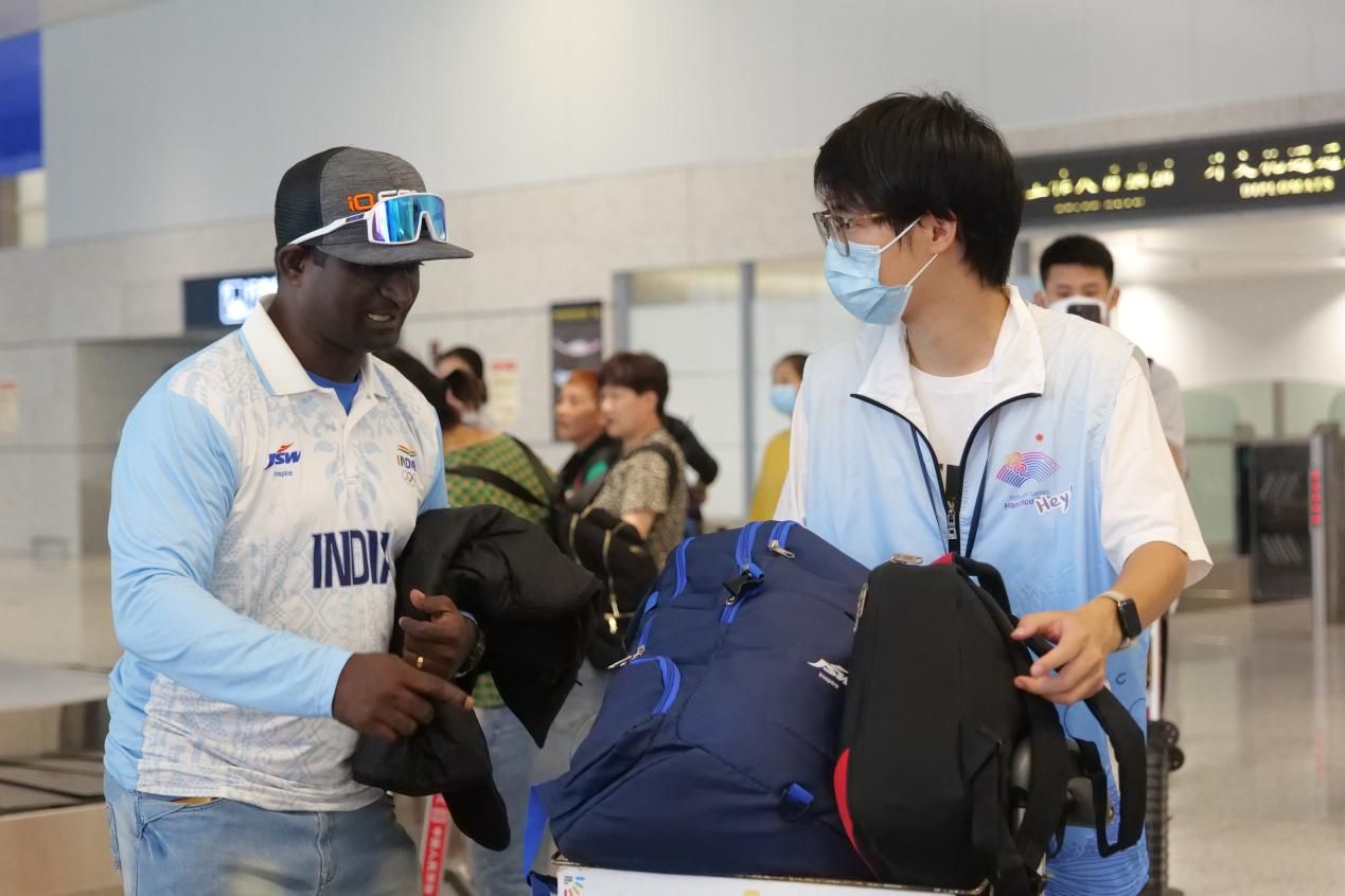 图为宁波机场亚运礼宾员正在协助运动员提取行李