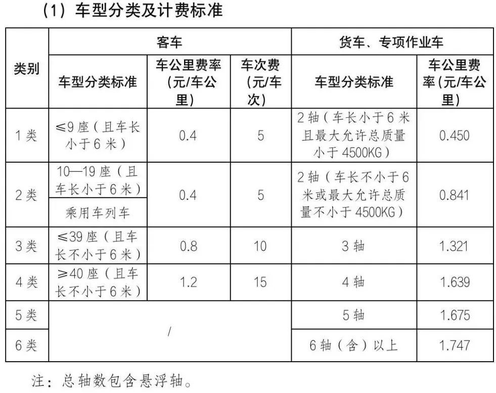 相关车型的收费里程,详见下表(最终收费标准以省政府批复为准):