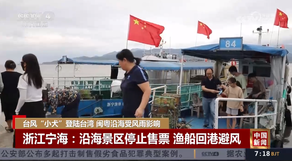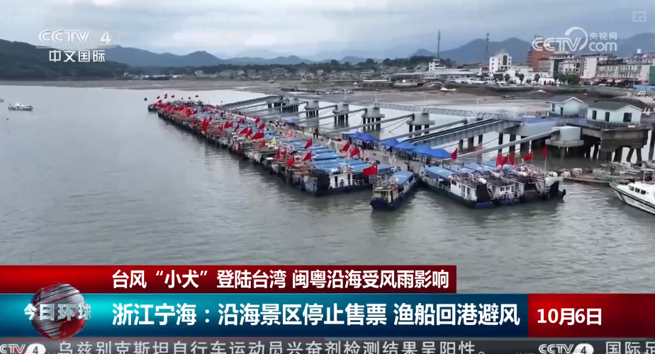 10月5日、6日,央视《共同关注》《朝闻天下》《中国新闻》《今日环球》栏目播出《浙江宁海 应对台风“小犬” 各沿海景区停止售票》,报道了受台风“小犬”影响,从昨天上午开始,宁波宁海县强蛟镇沿海景区全部停止售票,全面排查船只停靠和游客撤离情况。截至目前,强蛟镇相关景点以及休闲项目全部关闭。记者了解,宁波市注册的4000余艘渔船已经全部回港避风。