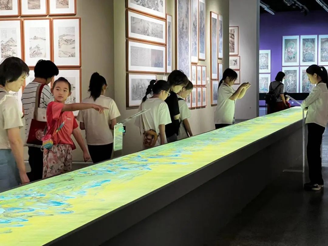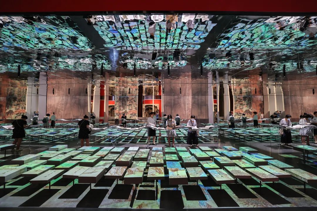 这次展览特设的沉浸式数字展厅惊艳了众人。40件收藏于海外博物馆的绘画精品,在光影中“动起来”了,在数字世界“活起来”了。游鱼点墨、雪山旅行、山涧品幽、水榭观花、青绿河山五重画境空间,成为观众的网红打卡点。