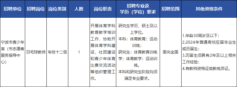 根据《宁波市事业单位公开招聘工作人员实施办法》和《关于进一步贯彻落实〈宁波市事业单位公开招聘工作人员实施办法〉的意见》等有关规定,共青团宁波市委所属宁波市青少年宫(市志愿者服务指导中心)决定面向社会公开招聘事业编制工作人员1名。