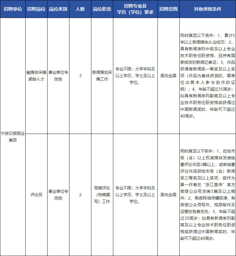 根据《宁波市事业单位公开招聘工作人员实施办法》和《关于进一步贯彻落实〈宁波市事业单位公开招聘工作人员实施办法〉的意见》等有关规定,宁波日报报业集团决定面向社会公开招聘事业编制工作人员5名。