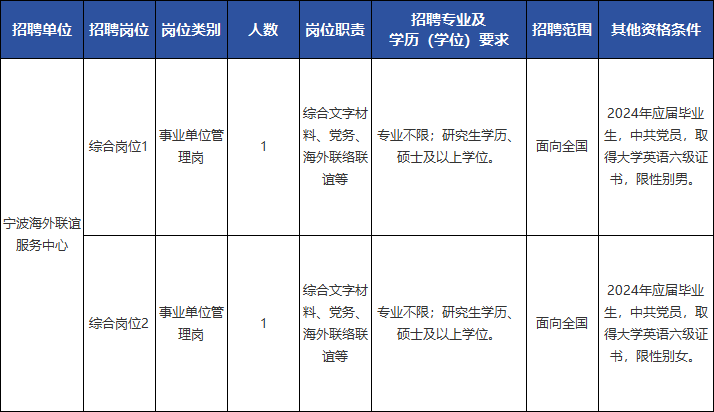 根据《宁波市事业单位公开招聘工作人员实施办法》和《关于进一步贯彻落实〈宁波市事业单位公开招聘工作人员实施办法〉的意见》等有关规定,中共宁波市委统一战线工作部所属事业单位宁波海外联谊服务中心决定面向社会公开招聘事业编制工作人员2名。