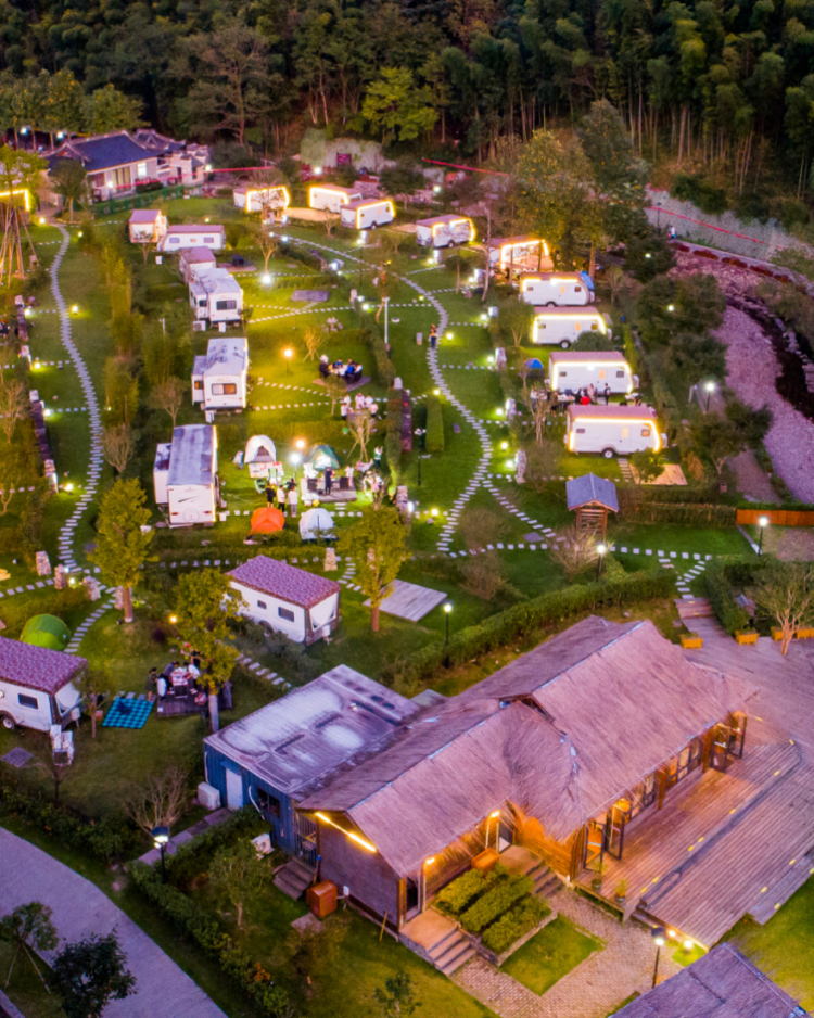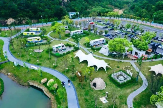 该营地包含房车营位区、自驾车营位区、团体型帐篷营位区、公共服务区、娱乐活动区,以及咖啡书吧、农事采摘、休闲餐厅等配套,围绕“全域旅游+体育+文化+乡村”模式,打造了集峡谷观光、生态休闲、主题体验、游憩服务、特色参与五大功能于一体的老少皆宜的户外乐园。