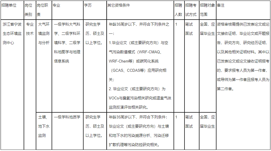根据《宁波市事业单位公开招聘工作人员实施办法》等有关规定,受浙江省生态环境厅委托,宁波市生态环境局决定面向全国公开招聘浙江省宁波生态环境监测中心事业编制工作人员2名。