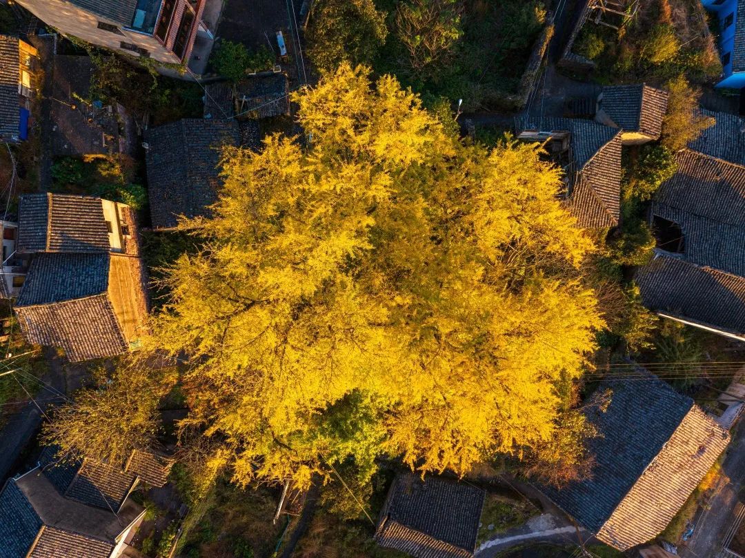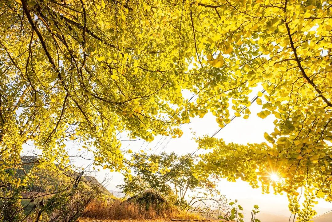 村内有一株枝繁叶茂、树干巨大的银杏树,现在正是它最好看的时候。银杏树矗立于村子中央,黄得抢眼,给这个宁静的小山村增添了不少秋意。
