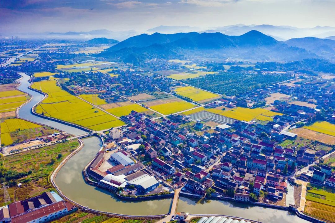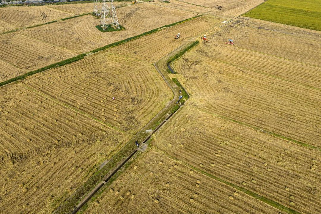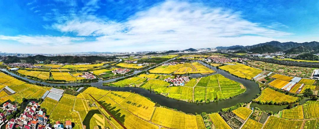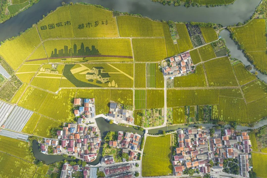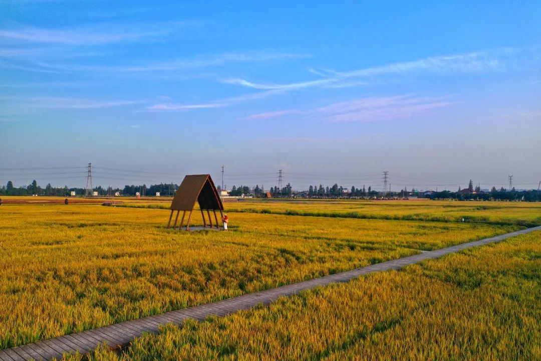 广袤的田野一片金黄,从空中俯瞰,金灿灿的稻田与纵横交错的河道、鳞次栉比的民房,构成一幅美丽的乡村画卷。