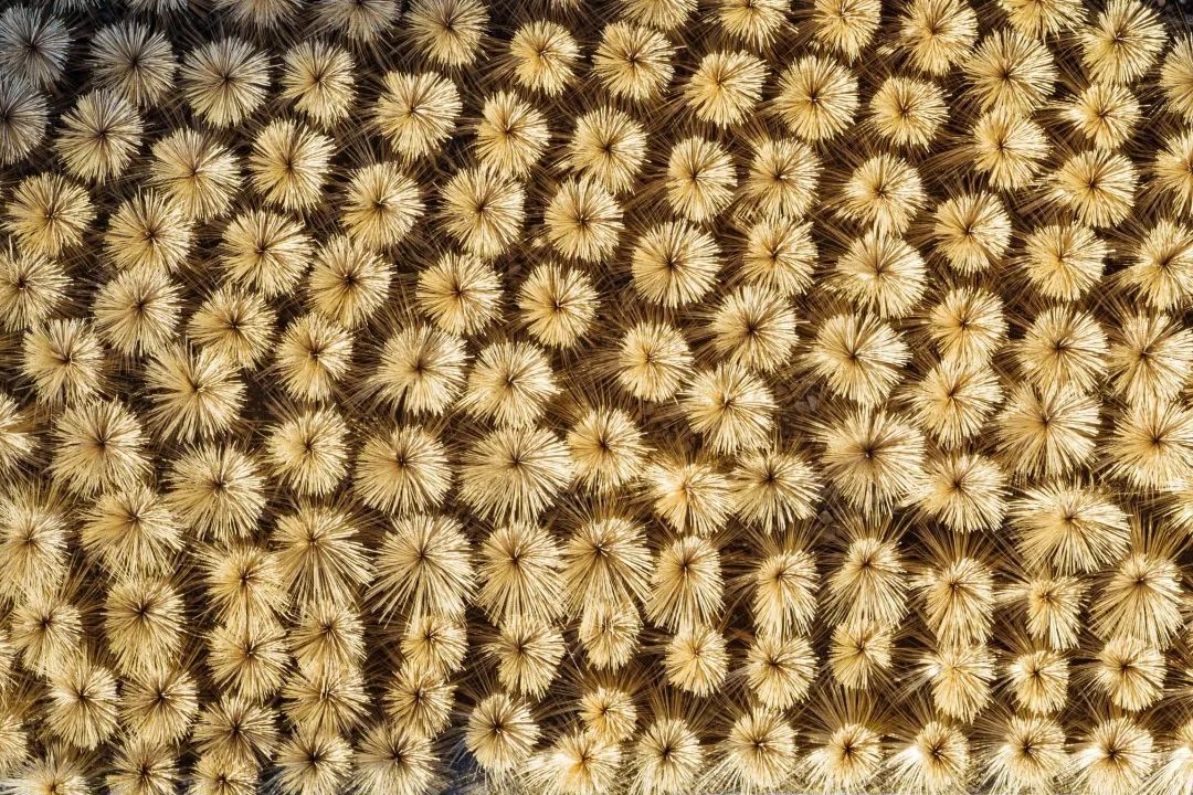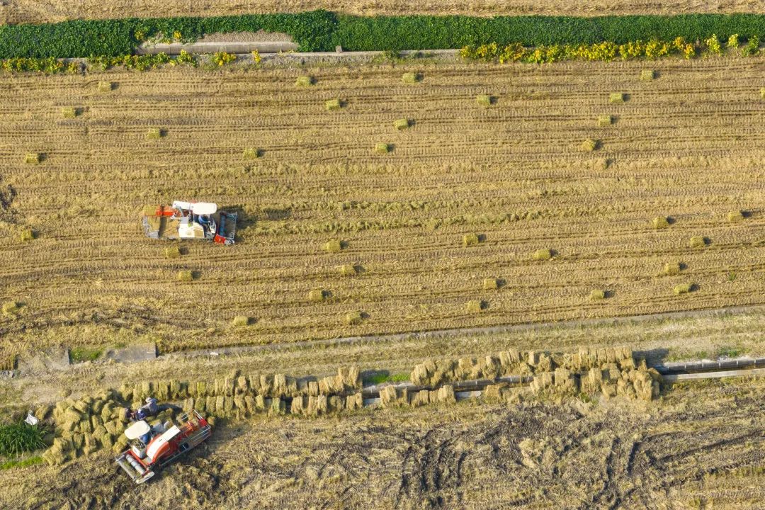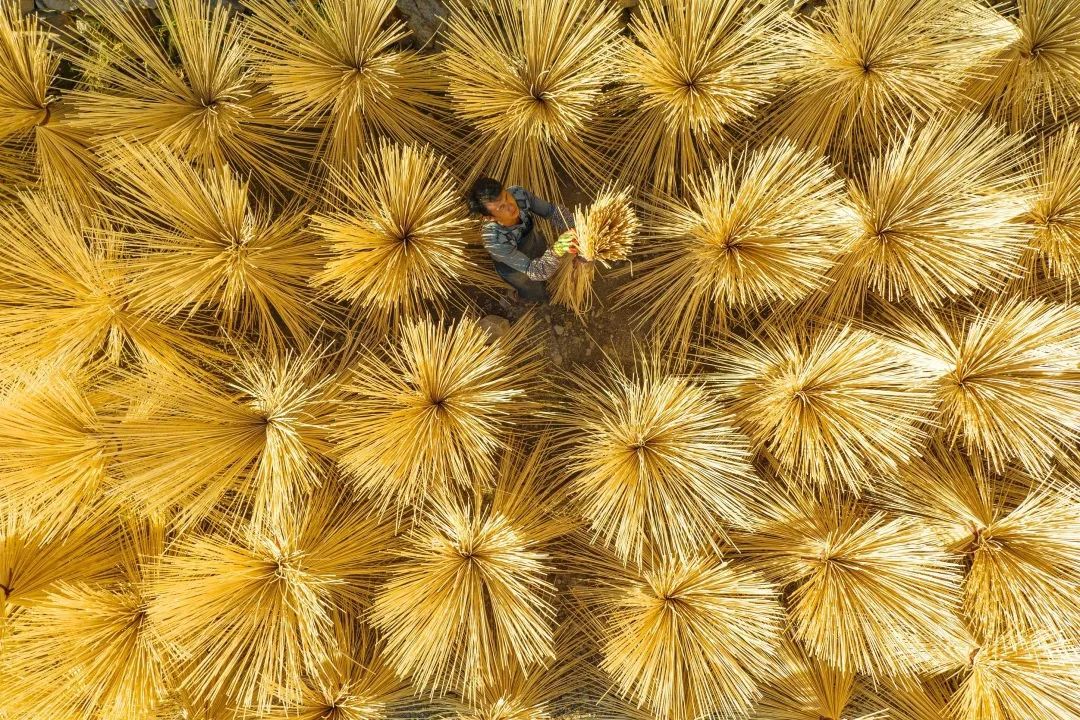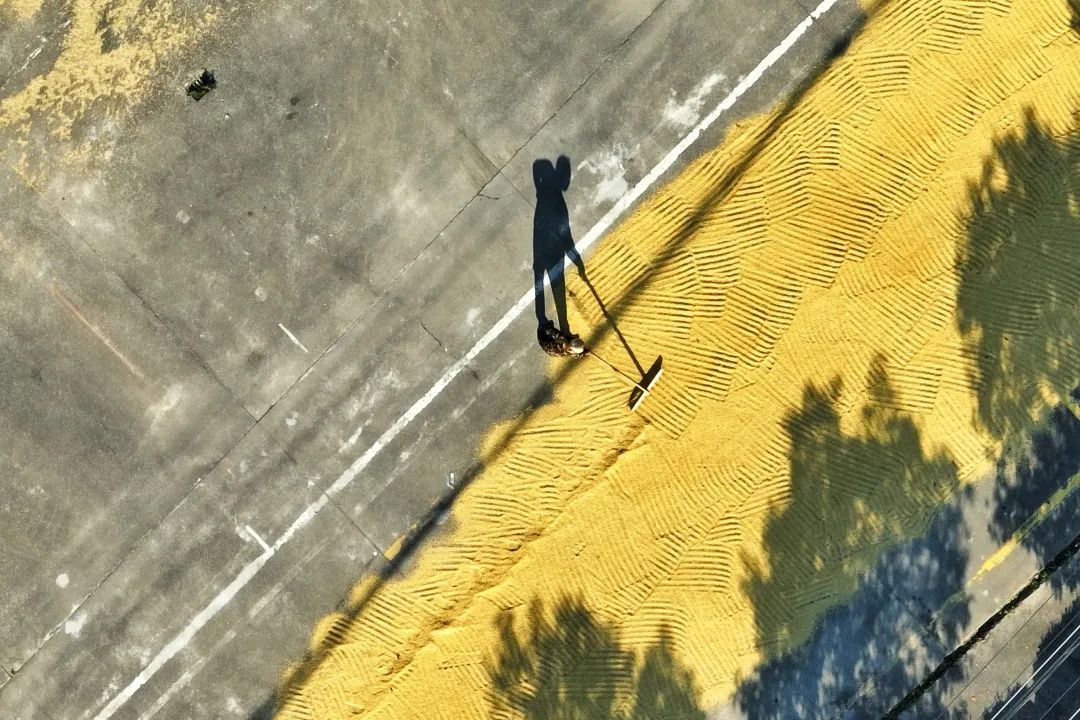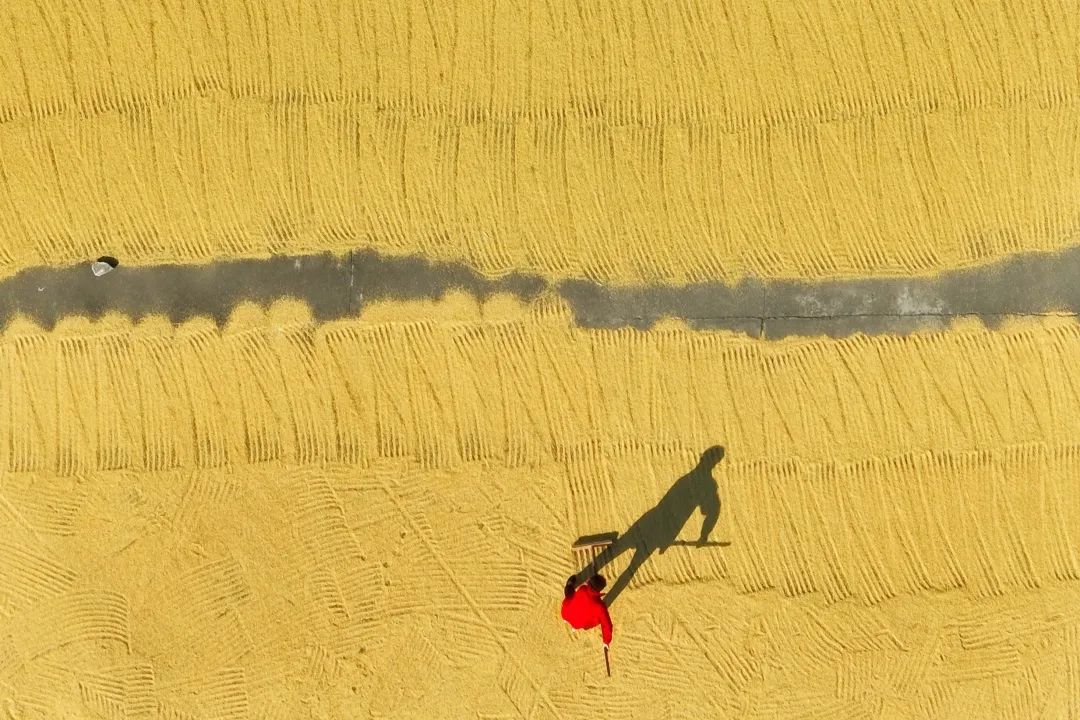 稻田金黄,秋收正忙,暖阳下翻晒的谷物寄托着今年的满足与来年的希望。
