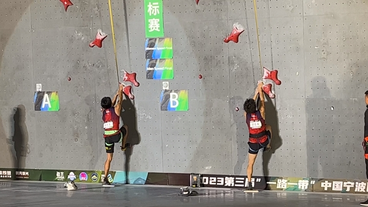 开幕式后,国际攀岩大师赛速度赛决赛率先上演。经过激烈对决,最终中国选手伍鹏在男子速度决赛中以5.026秒的成绩夺金,中国选手王欣尚以5.167秒摘银,印度尼西亚选手Aspar Jaelolo获得铜牌;女子速度攀岩决赛,中国选手邓丽娟获得金牌,韩国选手JIMIN JEONG获得银牌,中国选手张少琴获得铜牌。
