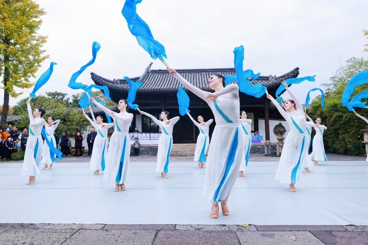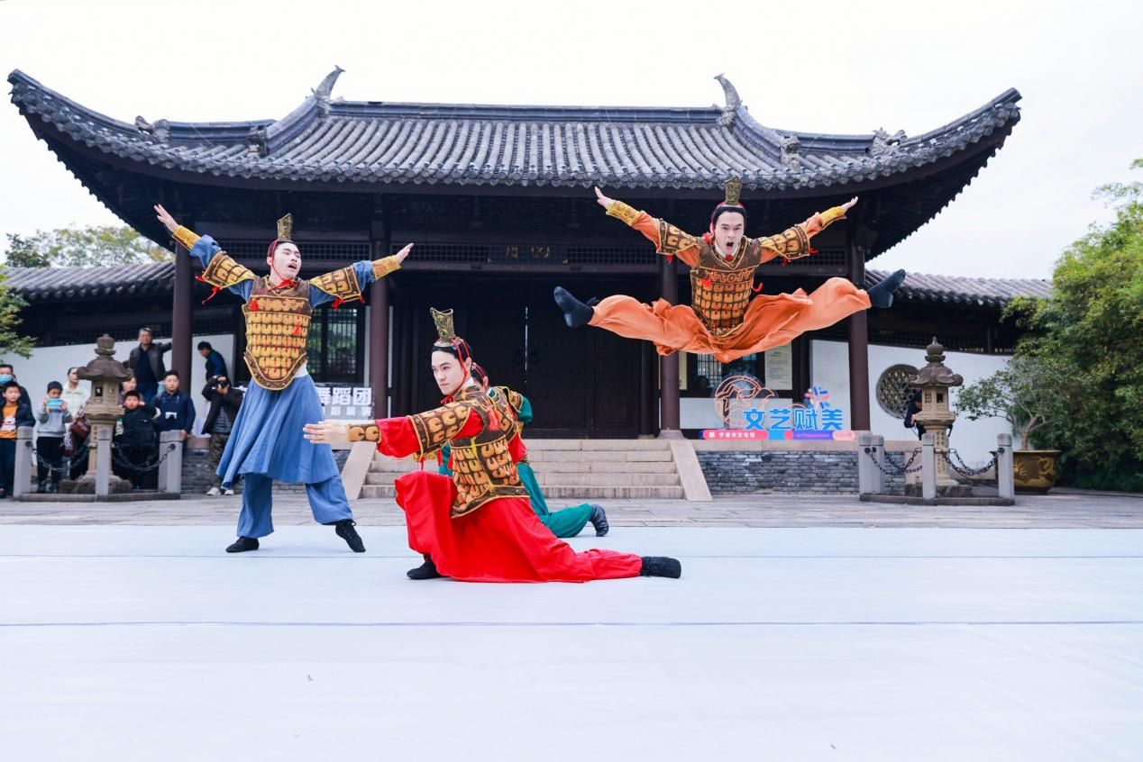 在展演现场,舞者们以月湖畔的石桥、柳树、古宅为布景,先后演绎了女子群舞《海的追寻》、双人舞《牧影随行》、男子群舞《秦王点兵》等作品,身着古典舞蹈服饰的舞者与自然风光完美相融,仿佛一幅动人的画卷,尽显月湖的恬静、柔美。