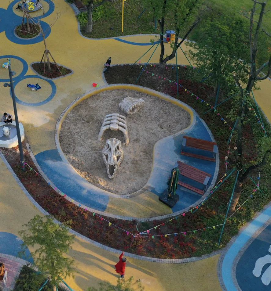 新的儿童公园,以串珠的方式设计了五大主题的儿童游乐活动区,包括配置的猫头鹰组合滑梯、河姆渡主题丛林攀树屋、戏水海盗船、组合秋千、跳跳云等儿童游乐设施。