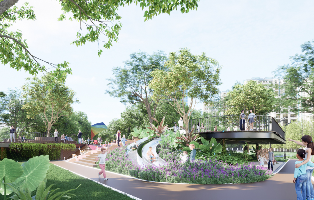 不仅如此,公园内的建筑废材与现状渣土,也将以塘渣垫层、铺装面层与景观地景等形式参与到公园新一轮的开发进程之中。