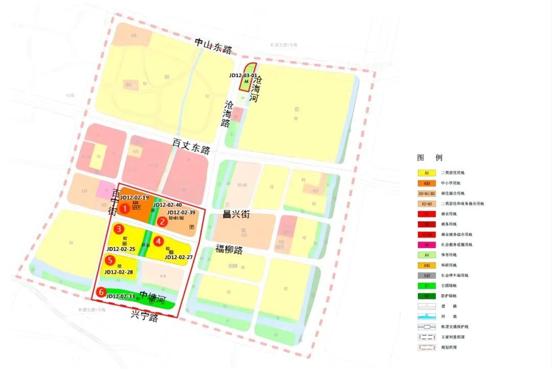 本次控规调整涉及两个区块:区块一为百宁街东侧、昌兴街南侧、沧海路西侧、兴宁路北侧地块,用地面积约17.78公顷;区块二为沧海路东侧、中山东路南侧、沧海河西侧地块,用地面积约0.46公顷。