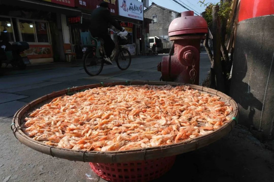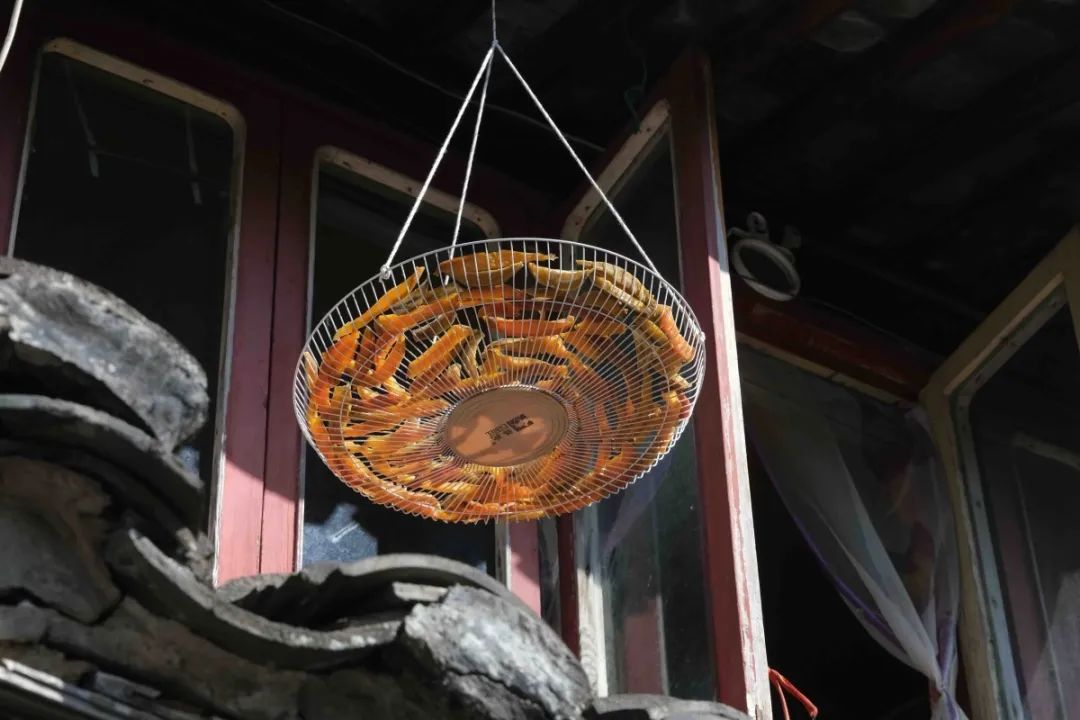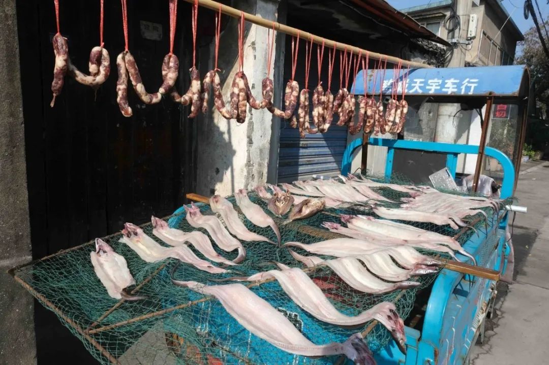 慈城的街巷,居民晒制的腊肠和河虾。张培坚/摄
