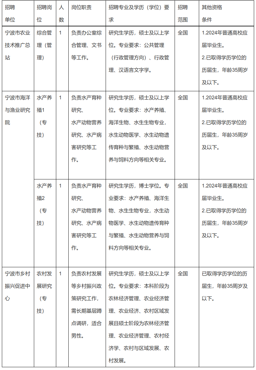 宁波市农业农村局下属事业单位公开招聘工作人员