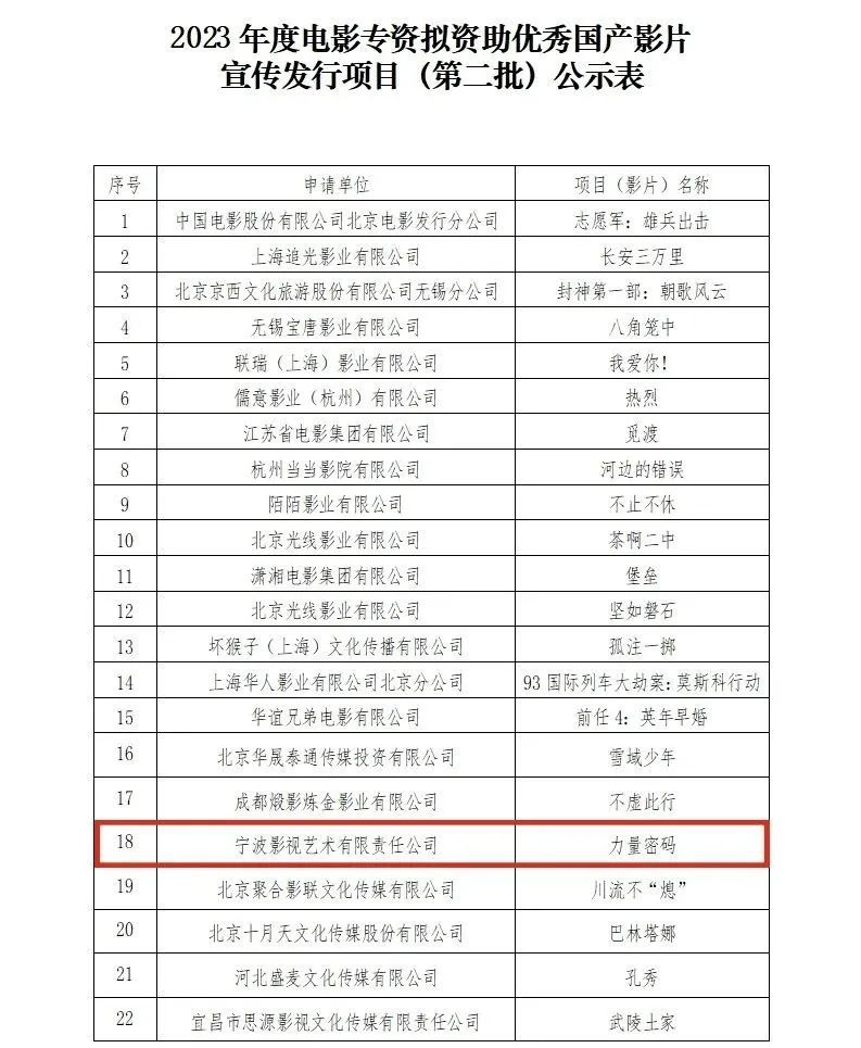 近日,宁波影视艺术有限责任公司摄制的电影《力量密码》入选2023年度电影专资资助优秀国产影片宣传发行项目,同批入选的有《志愿军:雄兵出击》《长安三万里》《封神第一部:朝歌风云》等21部优秀国产影片。这是《力量密码》二度获得国家级扶持。
