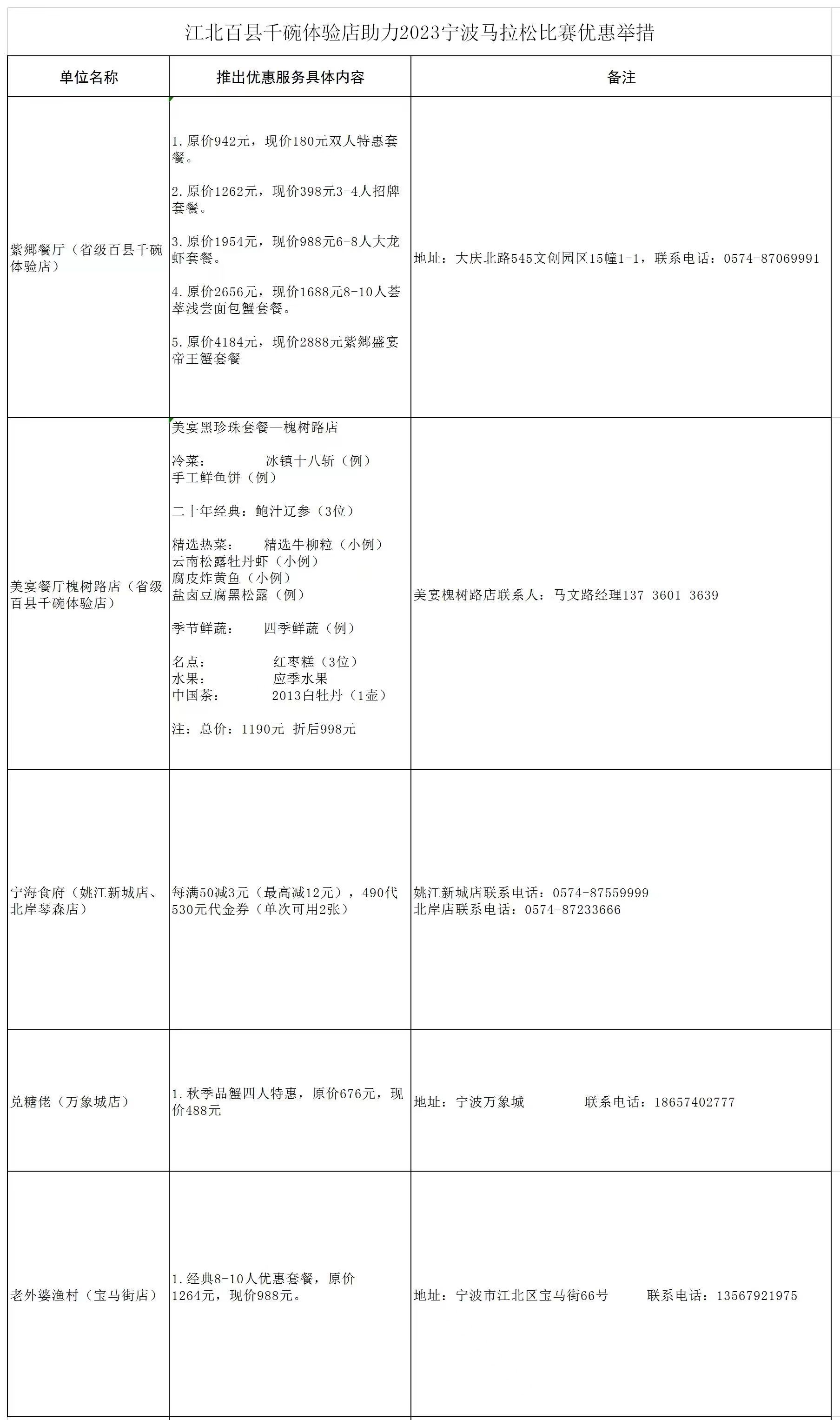 近年来,江北区深挖文化积淀,让江北美食既有味道又有根魂,既保留江北老底子又创新融合新菜系,相继推出江北十大碗、江北十大冷菜、江北十大点心,同时,创成8家“百县千碗”省级体验店,12家“百县千碗”市级体验店。用味蕾品味一座城,不失为认识一个城市最好的方式,2023年12月28日-2024年1月5日期间,紫郷餐厅、美宴餐厅槐树路店等“百县千碗”体验店及其他数家餐饮店推出优惠活动,2023宁波马拉松选手到店提供马拉松参赛报名证、号码牌即可享受优惠,让马拉松参赛者在舌尖感受城市温度。