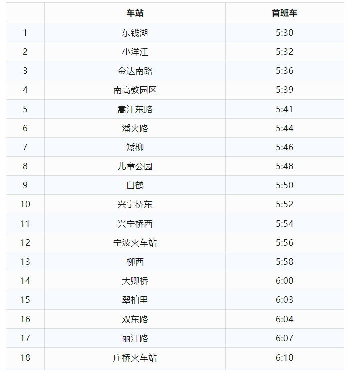 东钱湖往慈城方向各车站首班车时刻表