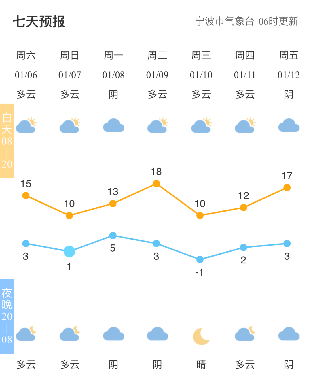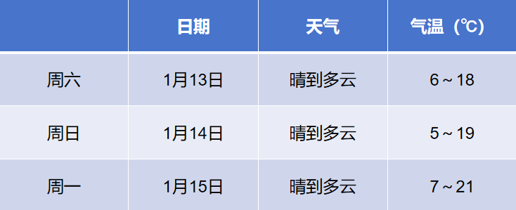 弱冷空气也随小寒节气而来,受其影响,这个双休日都是多云的天气,最高气温逐步走低,今天最高在15℃左右,明天下降到10℃上下,明天的风力略有增大,北到东北风3~4级。明天早晨的最低气温在3℃左右,局部有霜。