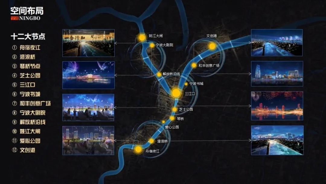 三江六岸夜经济项目共有舟宿夜江、澄浪桥、琴桥、芝士公园、三江口、宁波书城、和丰创意广场、宁波大剧院、解放桥沿线、姚江大闸、爱心公园、文创港等12大节点,拟分为两期实施。
