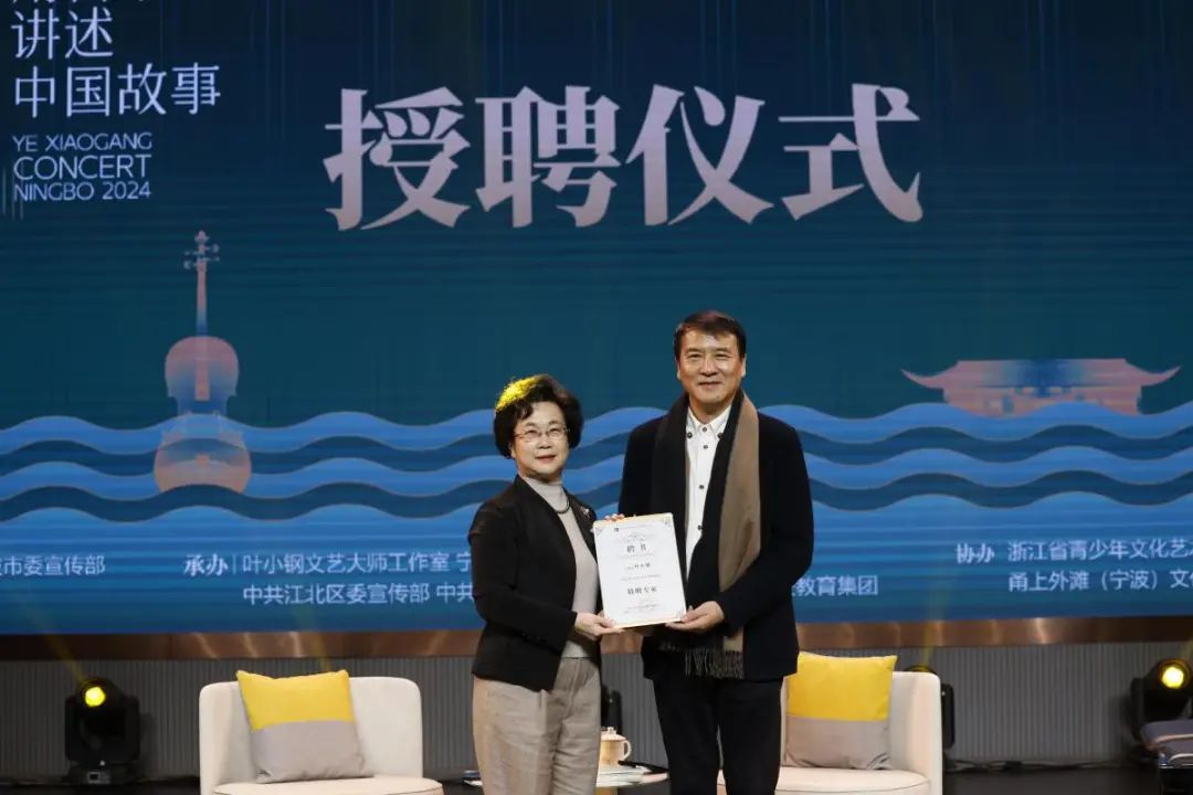 浙江传媒学院原党委书记、浙江省青少年文化艺术教育协会专家顾问委员会主任杨立平为叶小钢颁发浙江省青少年文化艺术教育协会特聘专家聘书。