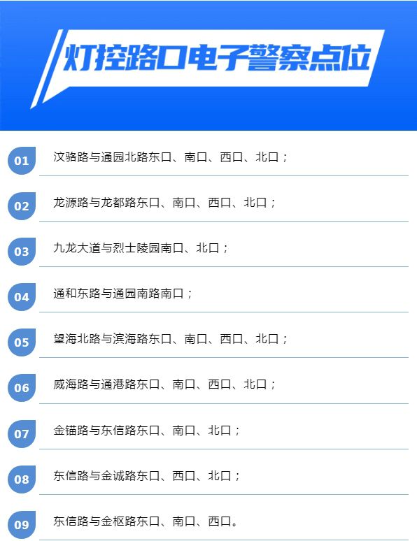 为进一步改善镇海区道路通行环境,缓解交通拥堵,促进市民文明出行,根据《中华人民共和国道路交通安全法》第三十九条的规定,决定自2024年1月28日起,在以下路口、路段启用下列电子警察: