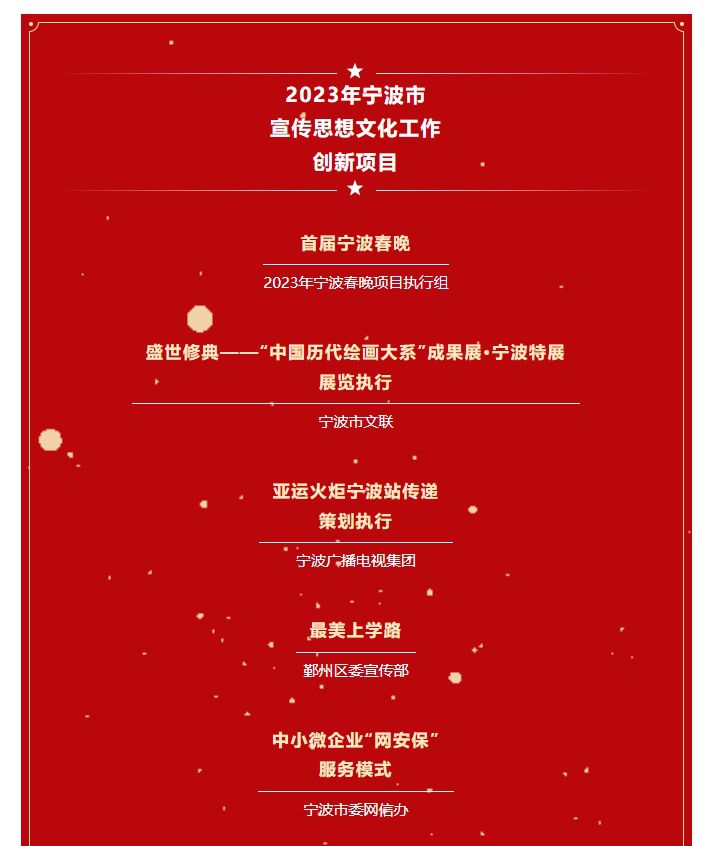 今天,2023年宁波市宣传思想文化工作创新项目名单公布,《首届宁波春晚》等11个项目被评为2023年宁波市宣传思想文化工作创新项目。一起来看↓