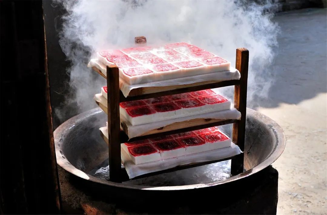 梁弄大糕用大米磨粉制作,填入豆沙馅再蒸熟,方方正正、白白净净的外形,配着红曲粉染色的吉祥话,其制作技艺已被列入宁波市非物质文化遗产代表作名录。刚出炉的梁弄大糕热气腾腾,浓郁的米香、红豆的清甜在口腔中流动,不粘牙又不松散。