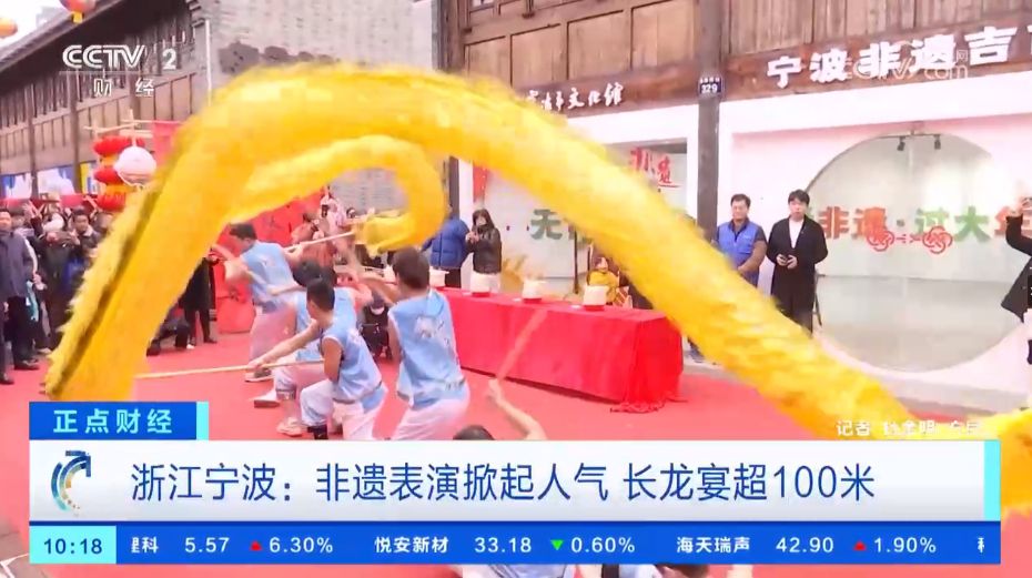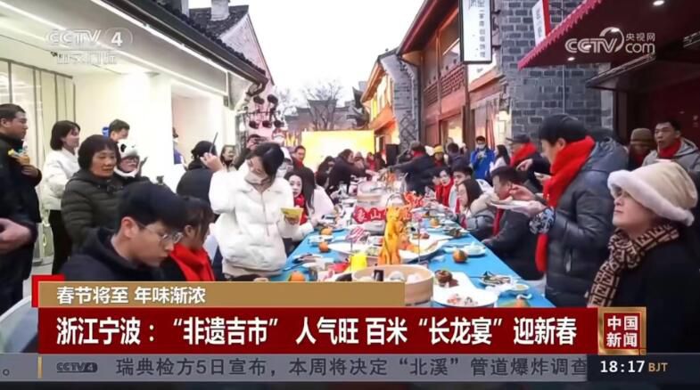 2月6日、7日,央视《中国新闻》《正点财经》栏目播出《年味:二十八 把面发 浙江宁波:赏非遗表演 品百米长龙宴》,报道了宁波南塘老街上演各类民俗表演,举办百米长龙宴,让民众、游客感受到了浓浓的年味。