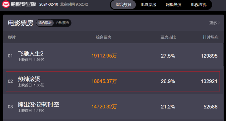 据“猫眼专业版”截至今日9:52的票房统计,由韩寒编剧并执导,沈腾、范丞丞、尹正、张本煜、孙艺洲领衔主演的《飞驰人生2》目前票房第一,1.91亿。《热辣滚烫》1.86亿位居第二,《熊出没·逆转时空》1.47暂列第三。