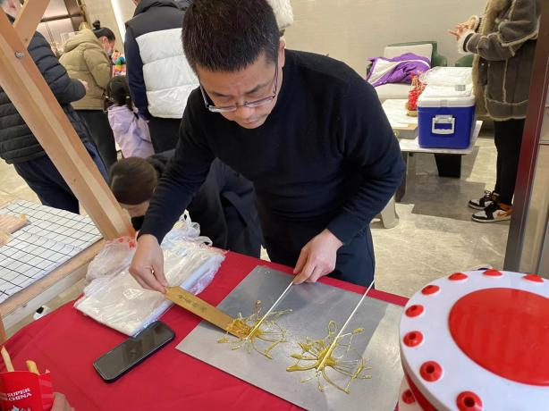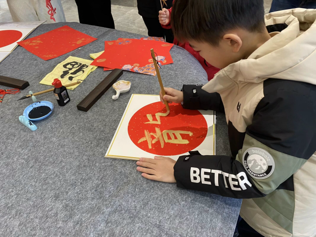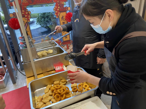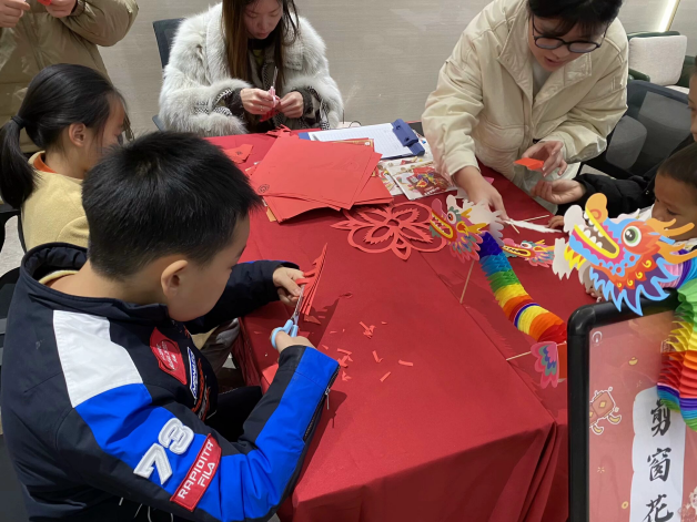 鄞州区钟公庙街道钟裕社区延续着“开门办年会”的传统,联动绿城物业、社区“达人”等各方资源,举办国潮民俗“祥龙贺岁”新春游园会,开设“开笔书福”写福字、“龙年限定”剪纸、“吉祥结”中国结编织、“银柳福袋”服务活动评价等互动摊位,在“福”字摊头,书法老师给居民们讲述“福”字的由来、楷书写法以及贴福小故事,在老师的示范和帮助下,大家挽袖提笔挥毫泼墨,一个个“福”字跃然纸上,这是大家对新年的祝福与愿望。在另一边的纸龙摊头,孩子们三五成群在一起折龙头、剪彩纸,将头尾粘在一起,不一会儿一个个活龙活现的拉花纸龙映入了眼帘。
