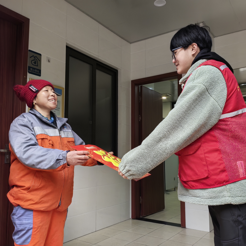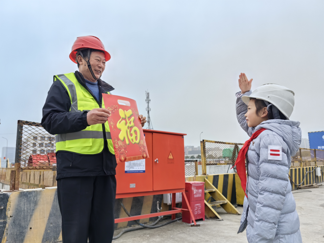 在江北区庄桥街道天悦社区,关爱留甬过年的新宁波人很有“心”。“这是新春福袋,里面有福字和对联,还有一份健康礼包送给大家,祝大家新年快乐!”天悦社区优秀少先队员代表向党建联建单位宁波市轨道交通7号线项目部送上了新春祝福。