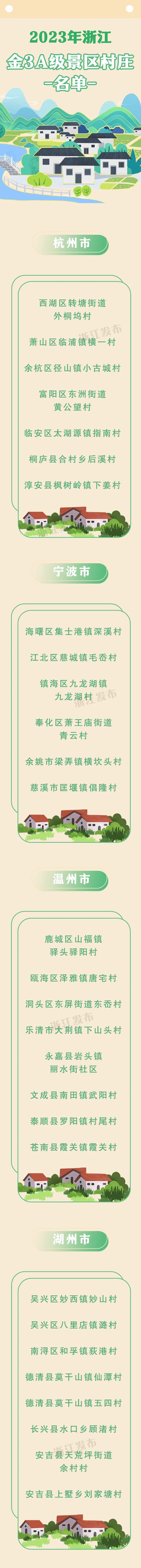 日前,省文化广电和旅游厅、省农业农村厅联合发布通知,认定杭州市西湖区转塘街道外桐坞村等58地为2023年全省金3A级景区村庄。