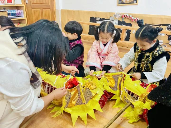 奉化区第一实验幼儿园的小朋友们正在制作布龙 通讯员供图