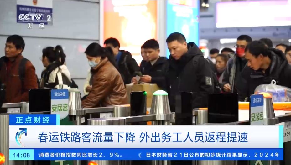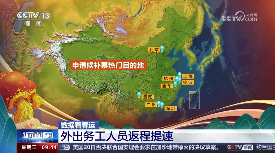2月21日,央视《朝闻天下》《新闻直播间》《天下财经》《正点财经》栏目先后播出《数据看春运 外出务工人员返程提速》,报道了在12306平台申请今天候补火车票的数据显示,随着外出务工人员的返程提速,候补票的热门目的地已经从北上广深,逐渐向贵阳、杭州、金华、宁波等城市扩展。
