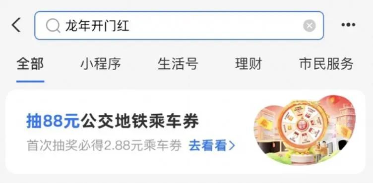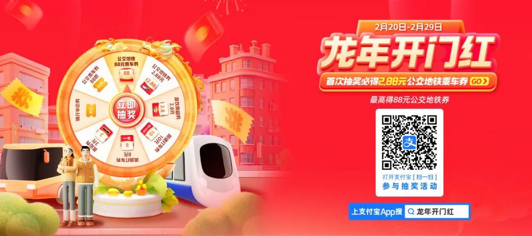 即日起,宁波市民参与支付宝“龙年开门红-大转盘抽奖”活动,必得2.88元地铁公交通用乘车券,更有机会赢取更多出行与支付优惠,最高可得88元地铁公交乘车券,单笔消费满0.01元即可使用。